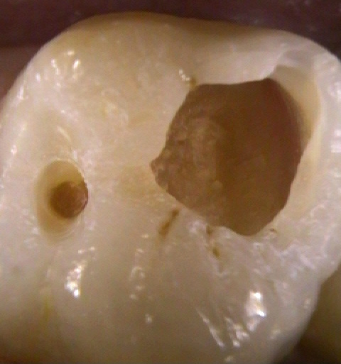 入口は小さいのですが、中の象牙質まで大きく虫歯は進行していました。 |